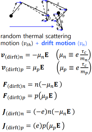 외부 전기장이 가해지면서 열적 평행상태에서의 운동은 지속하면서 전기장에 의한 이동이 동반하게 된다. 이를 통해 전류가 흐르게 된다. (u는 모빌리티)